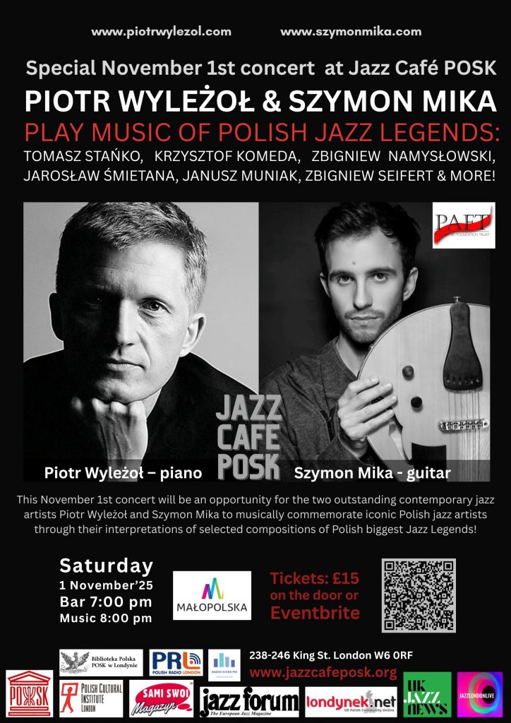 This November 1st concert will be an opportunity for the two outstanding contemporary jazz artists PIOTR WYLEŻOŁ and SZYMON MIKA to musically commemorate iconic Polish jazz artists through their interpretations of selected compositions of Polish biggest Jazz Legends!