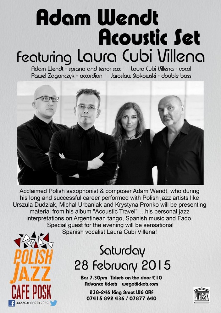 Gościnnie z kraju na scenie Jazz Café POSKu wystąpi wybitny saksofonista Adam Wendt, który zaprezentuje oryginalny program ze swojego ostatniego albumu “Acoustic Travel” będący jego personalną, zapierającą dech interpretacją argentyńskiego tanga, muzyki hiszpańskiej i portugalskiej muzyki Fado. Wraz z zespołem wystąpi sensacyjna wokalistka hiszpańska Laura Cubi Villena oraz Adam zagańczyk - akordeon i Jarosław Sokołowski - kontrabas. Adam Wendt to jeden z czołowych polskich saksofonistów, laureat wielu nagród, współtwórca sukcesu i repertuaru legendarnej grupy Walk Away. Nagrywał i koncertował z takimi sławami muzyki jazzowej jak Randy Brecker, Mike Stern, Eric Marienthal (Chick Corea, GRP Big Band), Mino Cinelu (Weather Raport, Miles Davis), Frank Gambale (Chick Corea), David „Fuze” Fiuczyński (R.Brecker, R.S.Jackson, G.Russel), Dean Brown (Roberta Flack, David Sanborn), Michał Urbaniak, Urszula Dudziak, Nippy Noya oraz znakomitościami czarnego bluesa takimi jak Sidney „Guitar Crusher” Selby oraz Keith Dunn. Koncertuje z mistrzem candombe, bandeonistą Luisem di Matteo z Urugwaju. W 1990 roku Walk Away z Urszulą Dudziak otwierali europejskie koncerty Milesa Davisa. Dotychczas wziął udział w nagraniu ok. 70 płyt nie tylko jako saksofonista, ale również jako kompozytor i aranżer. Jest zapraszany do udziału w nagraniach programów radiowych i telewizyjnych oraz festiwalach. Jako solista i muzyk sesyjny współpracował z jazzową czołówką Polski oraz gwiazdami muzyki popularnej. Oprócz działalności typowo koncertowej i artystycznej często prowadzi zajęcia edukacyjne w ramach Małej Akademii Jazzu (m.in. Gorzów Wlkp., Zakopane) oraz Warsztatów Muzycznych w Chodzieży, Zakrzewie, Ustrzykach Dolnych, Koszalinie, Leichligen (Niemcy). http://adam-wendt.pl