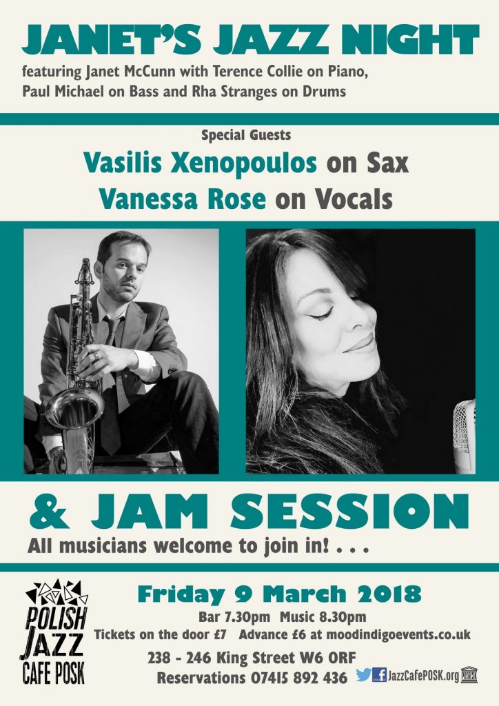 Wokalistka jazzowa Janet McCunn raz w miesiącu zaprasza do Jazz Café wybitnych londyńskich muzyków jazzowych. Wieczὀr składa siȩ z trzech czȩści: wystȩpὀw instrumentalnych, wokalnych i jam sessions. Każdy może zagrać czy zaśpiewać po zapisaniu siȩ na listȩ. Liczy siȩ kolejność zgłoszeń. Kupienie biletu przez internet jest automatycznym zapisem.